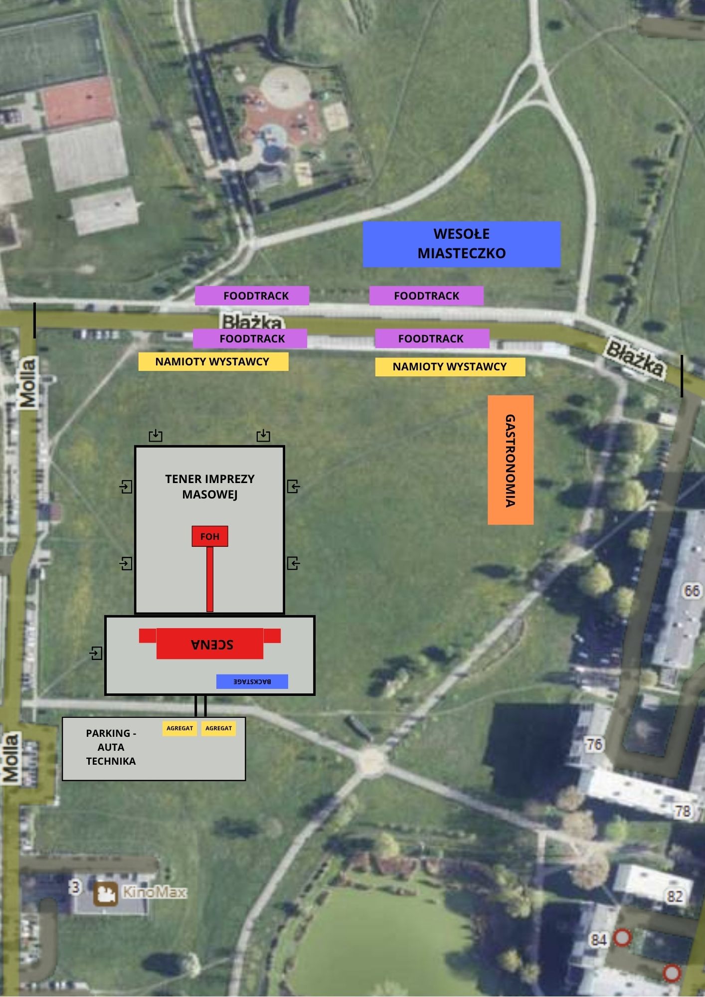7. Oferent musi przedstawić propozycję rozmieszczenia poszczególnych Punktów Gastronomicznych, Food Trucków, Punktów Handlowych, Strefy Alkoholowej i Stref Dodatkowych na załączonej mapie sytuacyjnej – z zachowaniem drożności dróg ewakuacyjnych.
